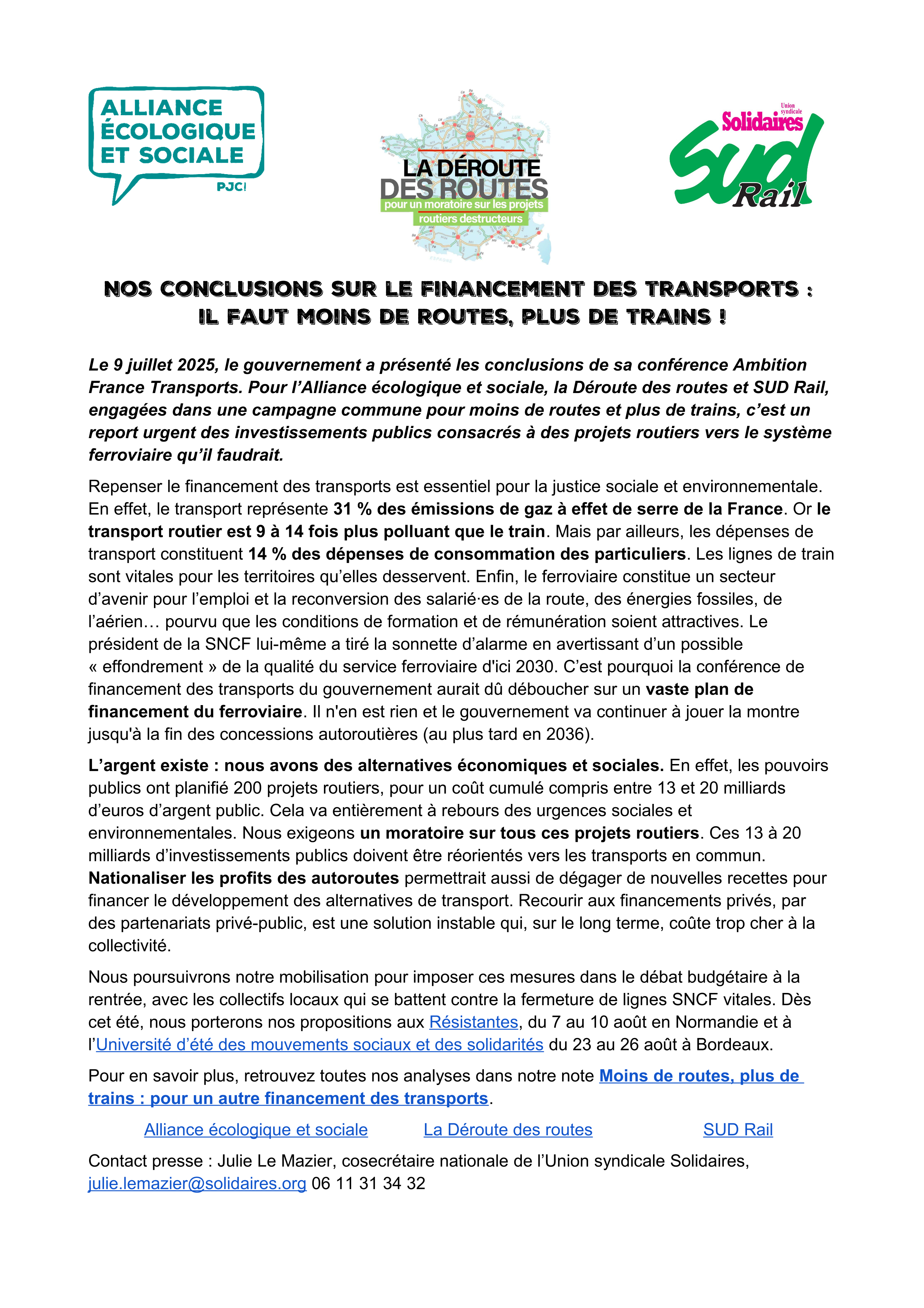 Le 9 juillet 2025, le gouvernement a présenté les conclusions de sa conférence Ambition France Transports. Pour l’Alliance écologique et sociale, la Déroute des routes et SUD Rail, engagées dans une campagne commune pour moins de routes et plus de trains, c’est un report urgent des investissements publics consacrés à des projets routiers vers le système ferroviaire qu’il faudrait.