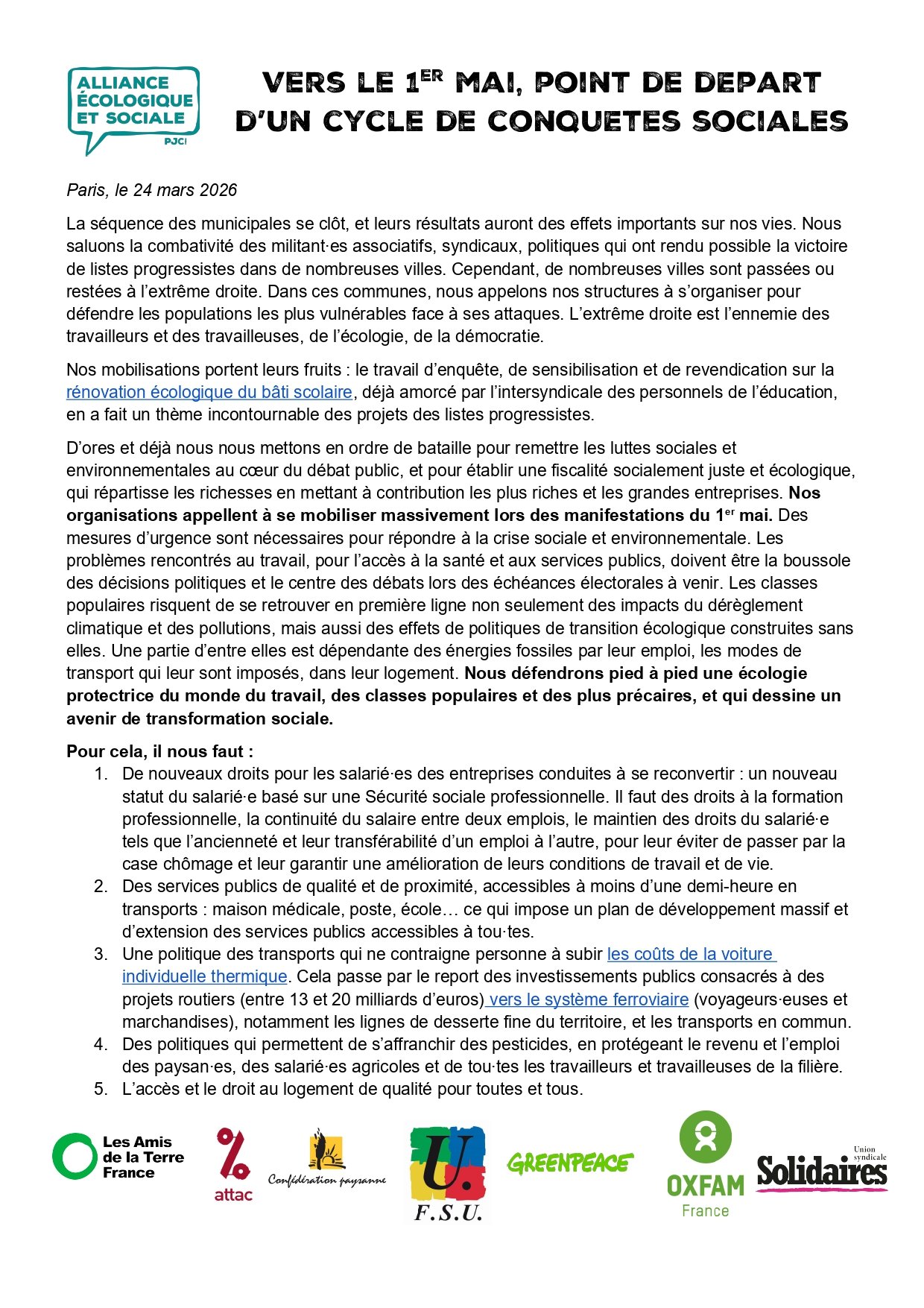 Communiqué à retrouver sur le site de l'Alliance écologique et sociale.
