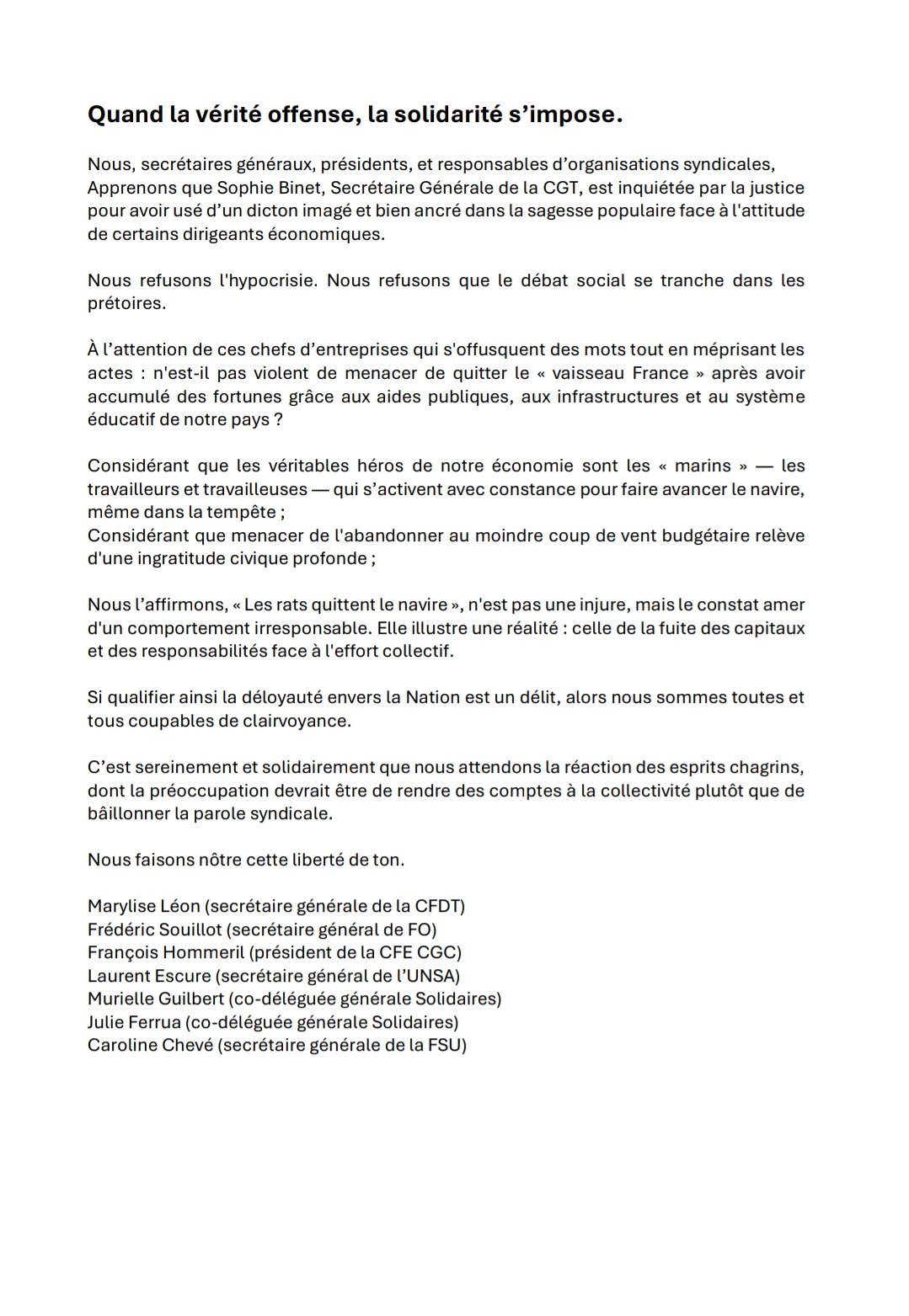 Nous, secrétaires générales, secrétaire généraux, président, co-déléguées, et responsables d’organisations syndicales, apprenons que Sophie BINET, Secrétaire Générale de la CGT, est inquiétée par la justice pour avoir usé d’un dicton imagé et bien ancré dans la sagesse populaire face à l’attitude de certains dirigeants économiques.