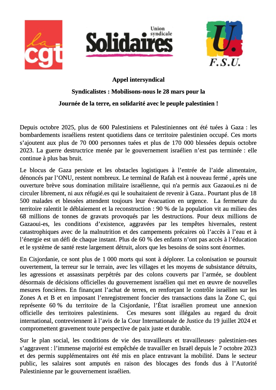 Nos organisations syndicales rappellent leur attachement internationaliste à une paix juste et durable, au respect du droit international et au droit des peuples à l’autodétermination. Elles appellent à se mobiliser et à rejoindre les manifestations dans toutes les régions françaises le 28 mars, à l’occasion de la Journée de la terre pour la défense des droits du peuple palestinien et exiger :