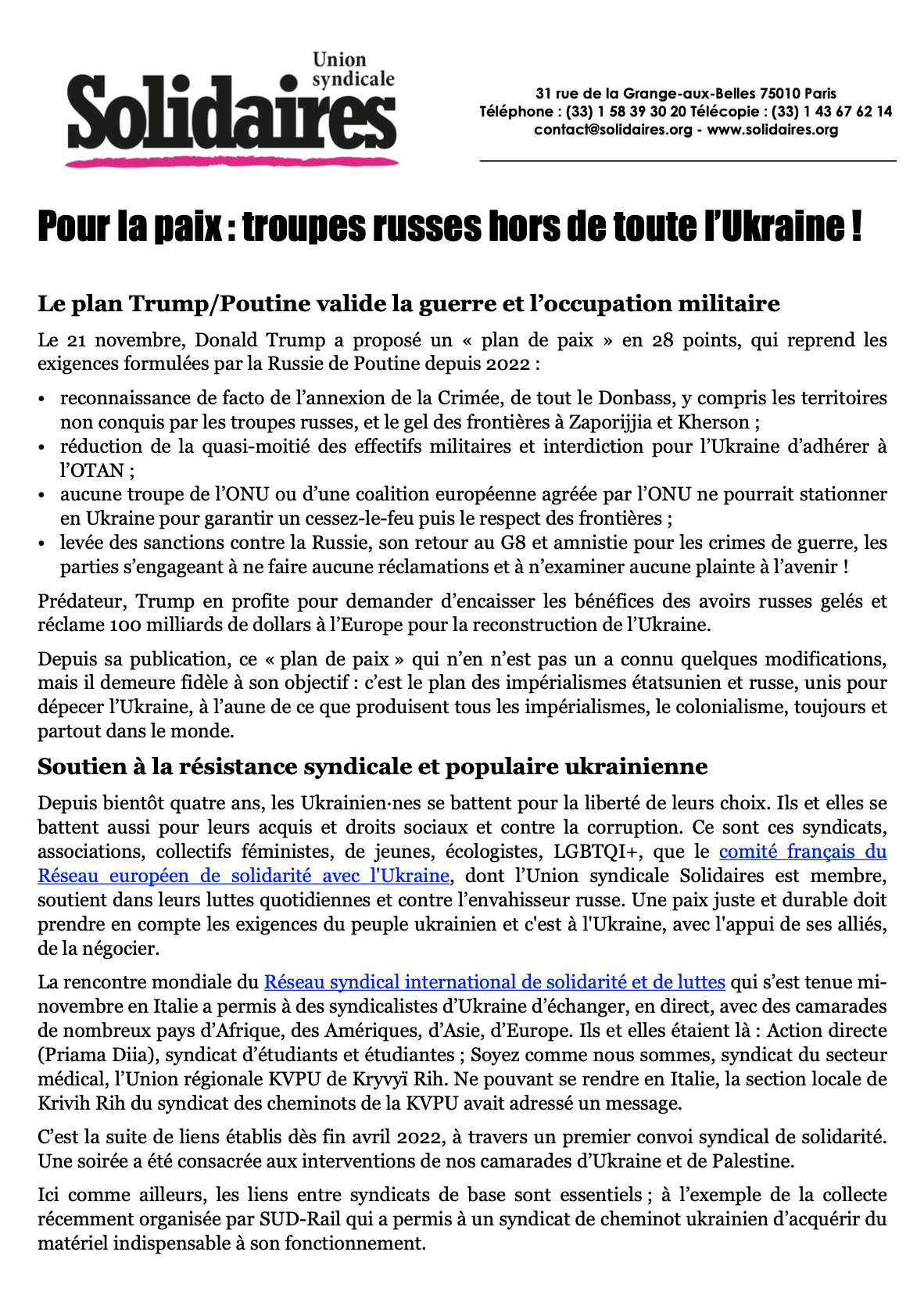 Depuis bientôt quatre ans, les Ukrainien·nes se battent pour la liberté de leurs choix. Ils et elles se battent aussi pour leurs acquis et droits sociaux et contre la corruption. Ce sont ces syndicats, associations, collectifs féministes, de jeunes, écologistes, LGBTQI+, que le comité français du Réseau européen de solidarité avec l'Ukraine, dont l’Union syndicale Solidaires est membre, soutient dans leurs luttes quotidiennes et contre l’envahisseur russe. Une paix juste et durable doit prendre en compte les exigences du peuple ukrainien et c'est à l'Ukraine, avec l'appui de ses alliés, de la négocier.