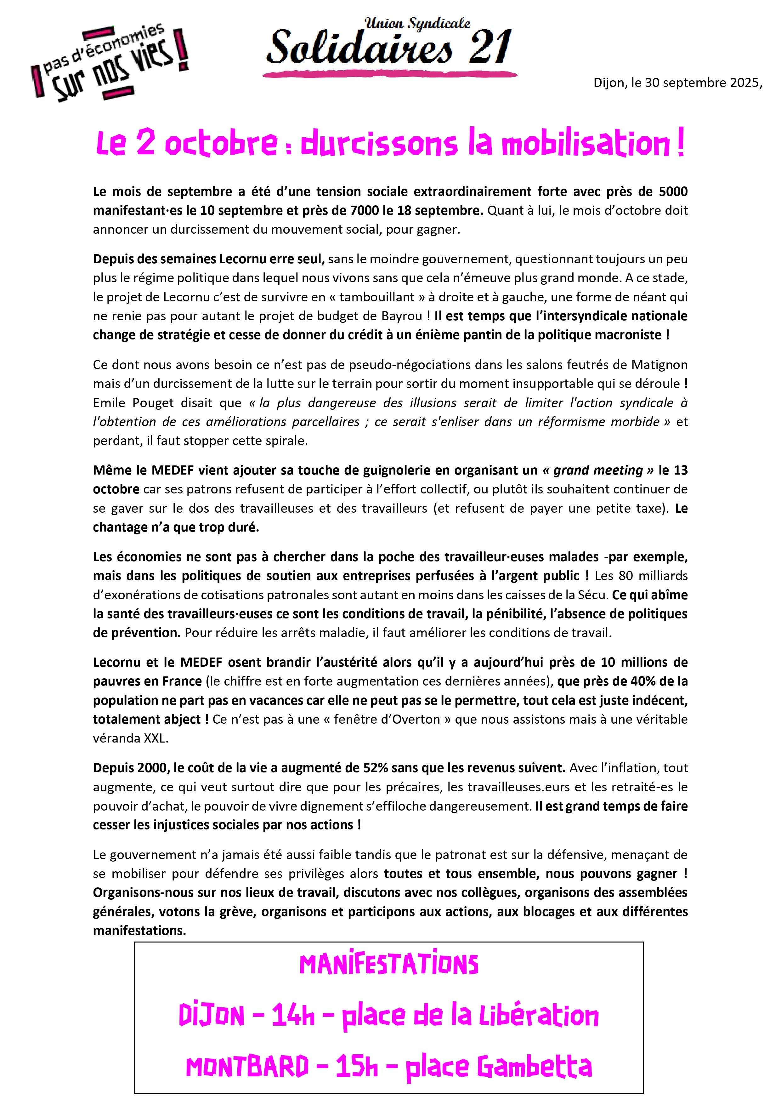Le 2 octobre : durcissons la mobilisation !