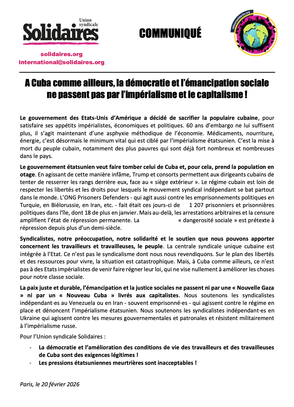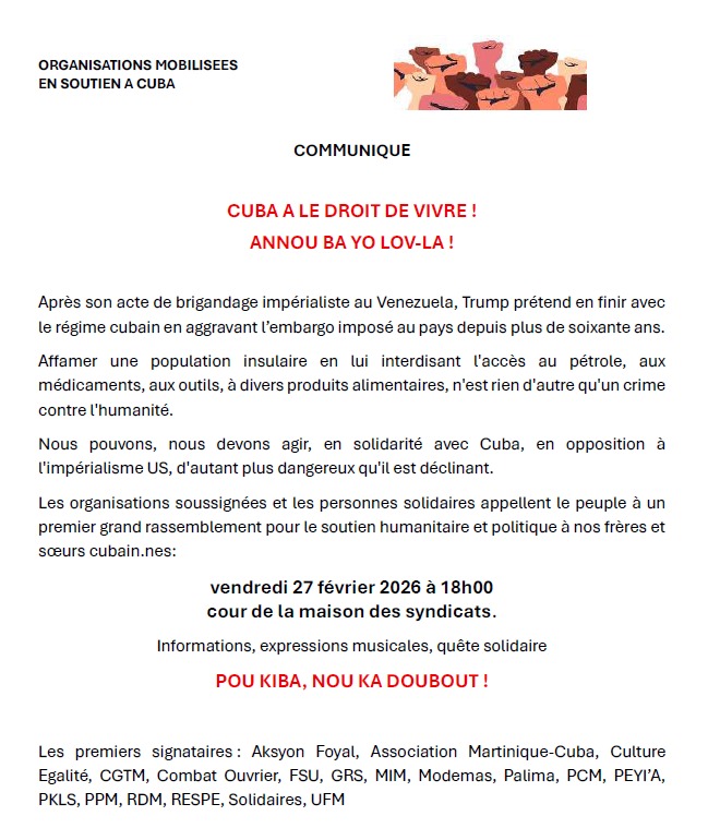 Fidèle à l'orientation internationaliste de notre syndicat, l'Union Syndicale Solidaires 972 affirme son soutien au peuple cubain, en particulier aux travailleuses et travailleurs, dont les conditions de vie sont dramatiquement impactées par le blocus américain.