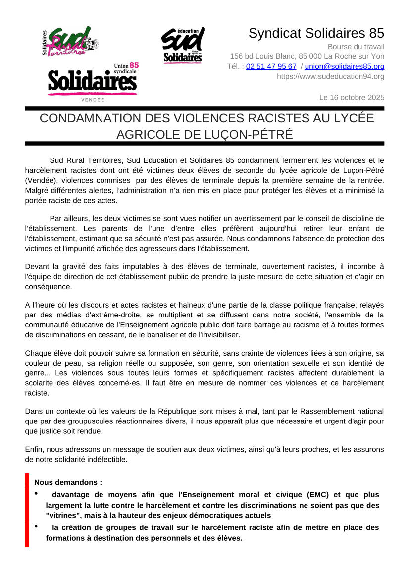 SUD Rural Territoires, SUD Éducation et Solidaires 85 condamnent fermement les violences et le harcèlement racistes dont ont été victimes deux élèves de seconde du lycée agricole de Luçon-Pétré (Vendée), violences commises par des élèves de terminale ce, sans qu’aucun adulte ne semble avoir réagi, ni protégé ces deux lycéens.