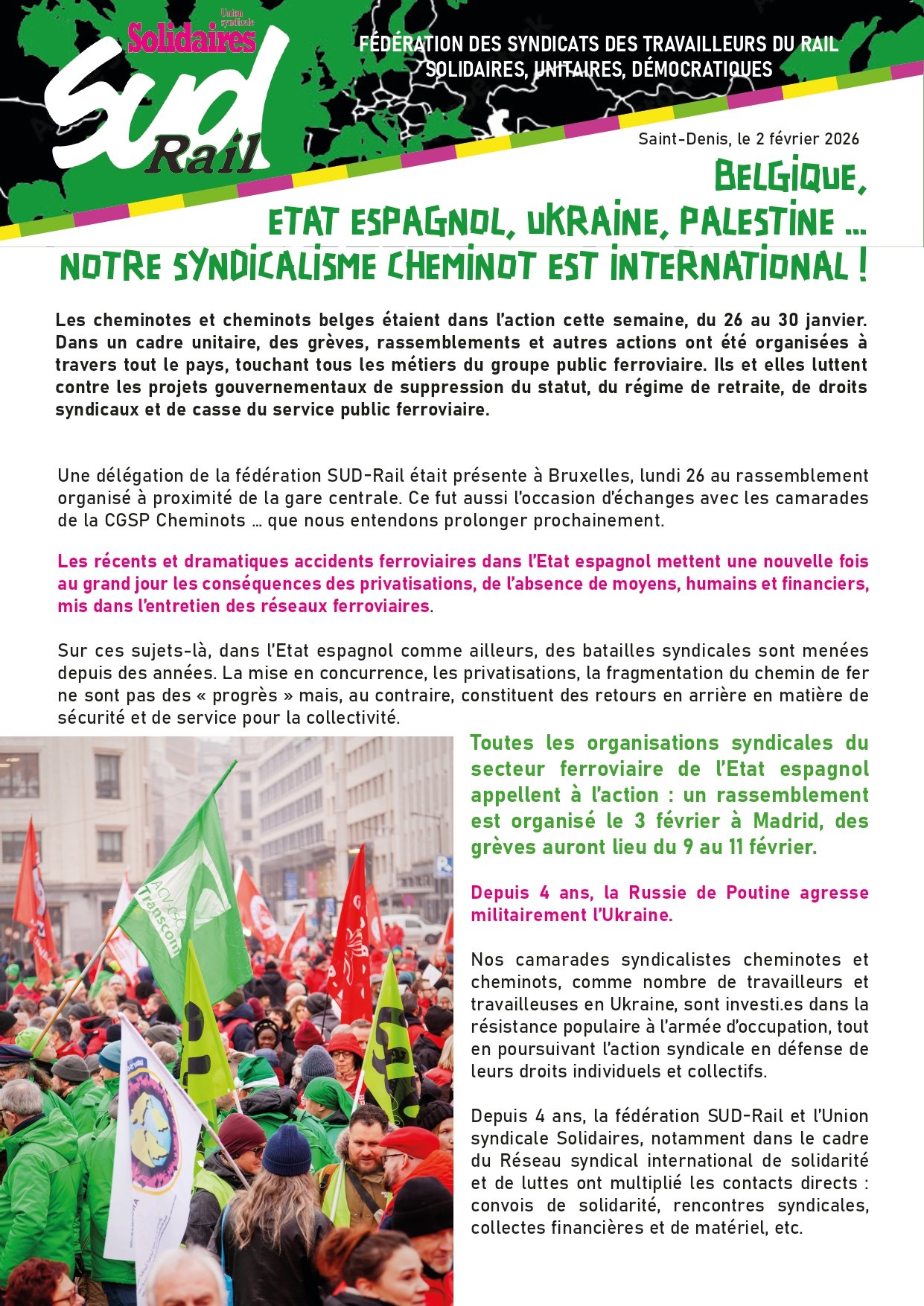 Belgique, Etat Espagnol, Ukraine, Palestine ... notre syndicalisme cheminot est international ! Vous trouverez une expression fédérale qui revient sur nos actions syndicales et internationalistes du côté de la fédération SUD-Rail.