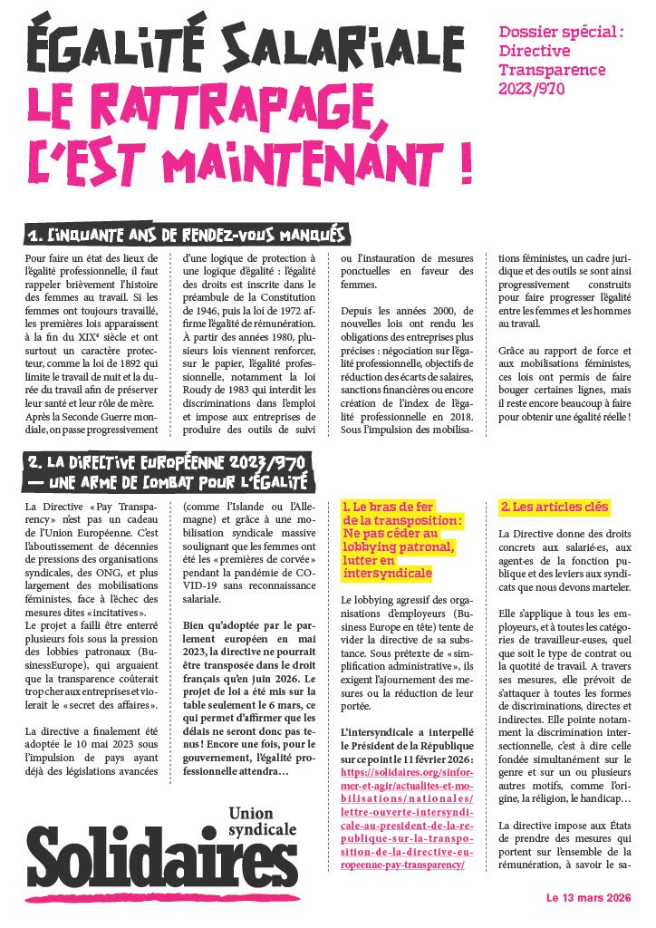 L'intersyndicale a interpellé le Président de la République sur ce point le 11 février 2026 : https://solidaires.org/sinformer-et-agir/actualites-et-mobilisations/nationales/lettre-ouverte-intersyndicale-au-president-de-la-republique-sur-la-transposition-de-la-directive-europeenne-pay-transparency/